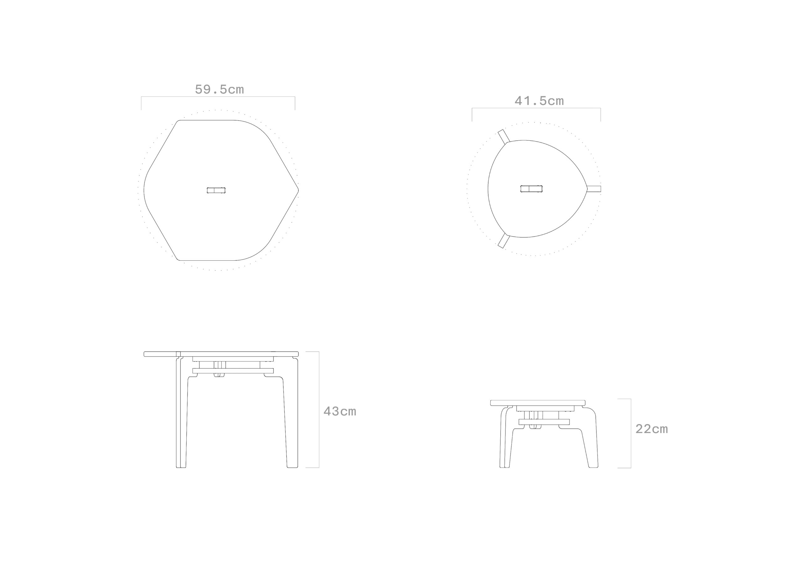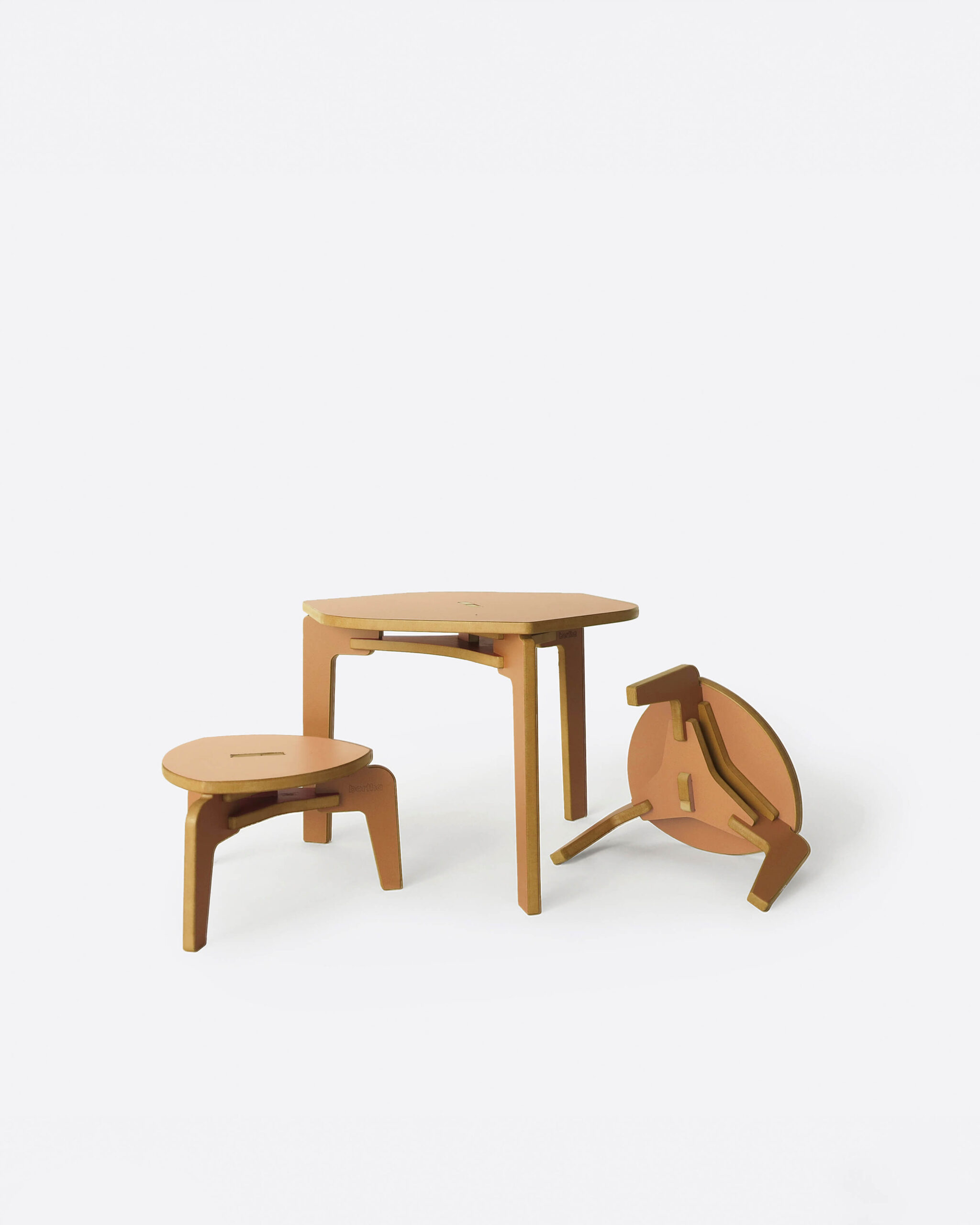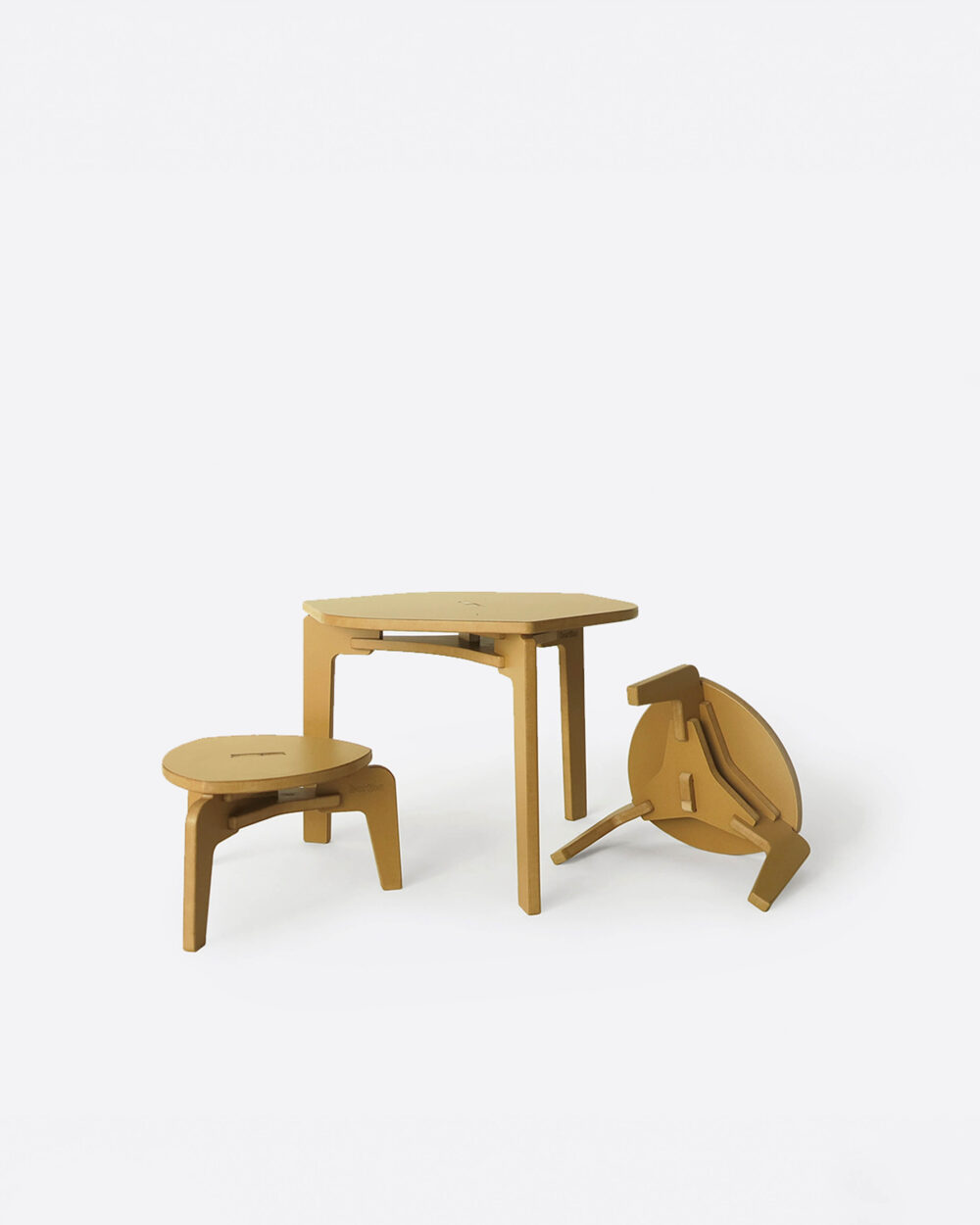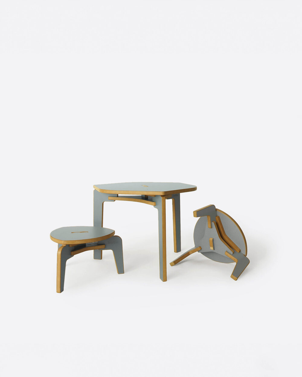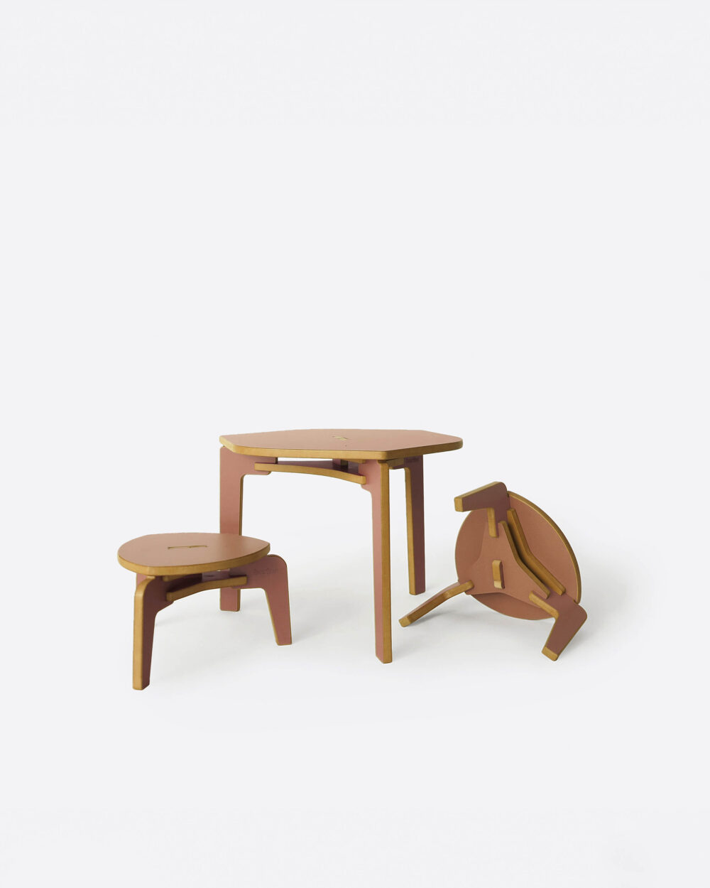 O conjunto inclui uma Mesa Colmeia (43 cm) e dois Bancos Turuninhos (22 cm).