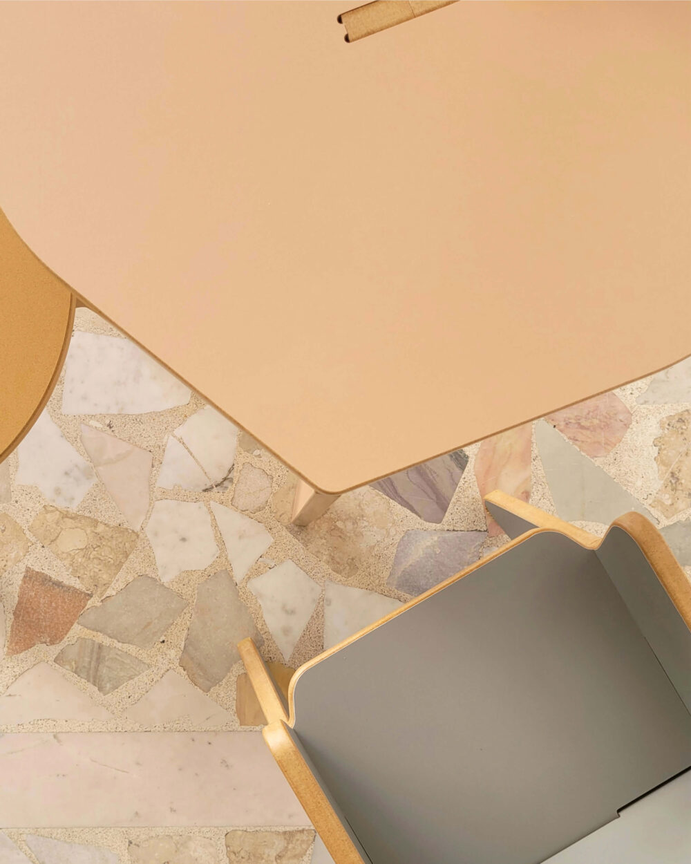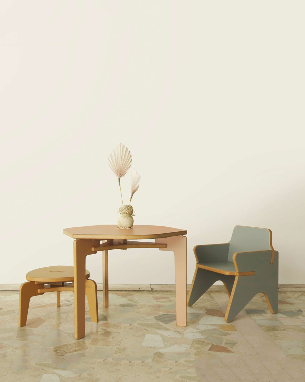 MDF de Pinus de reflorestamento (18mm), revestido nas duas faces com laminado melamínico colorido. Acabamento manual, com topos (parte amadeirada) lixados e selados com verniz fosco. Todas as peças do móvel possuem o mesmo material e espessura, garantindo estabilidade e qualidade ao produto.