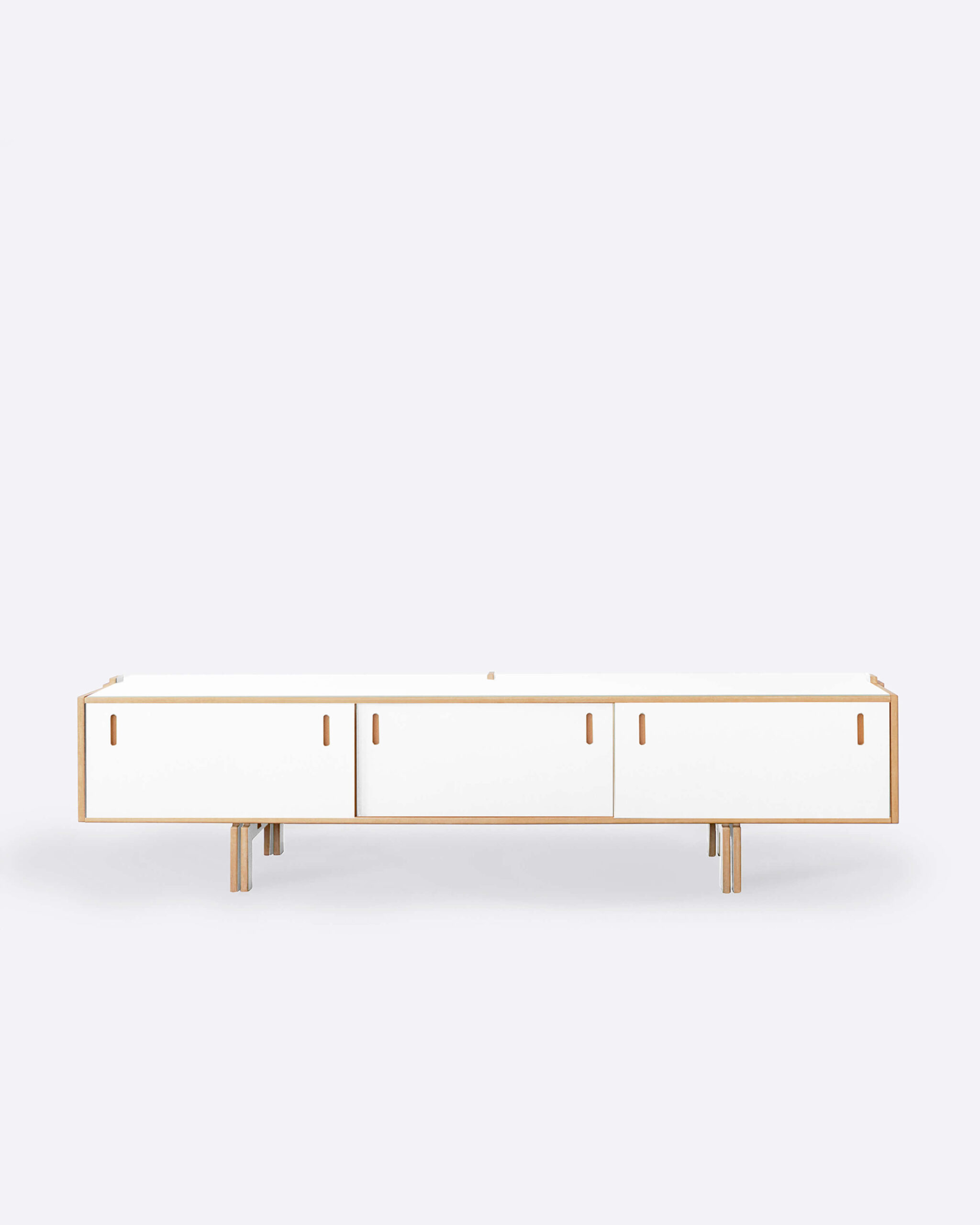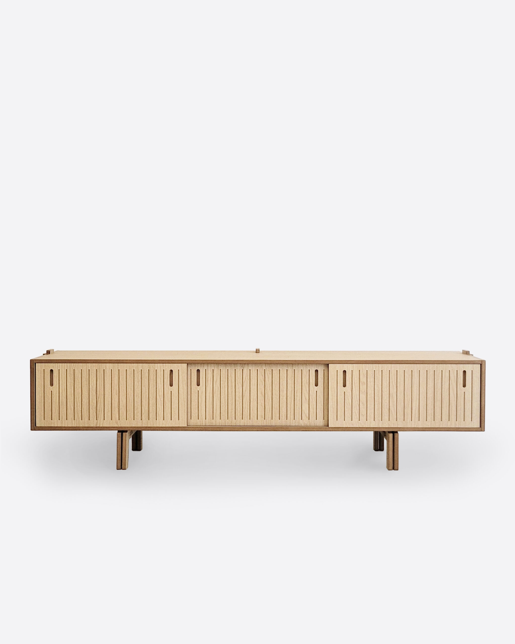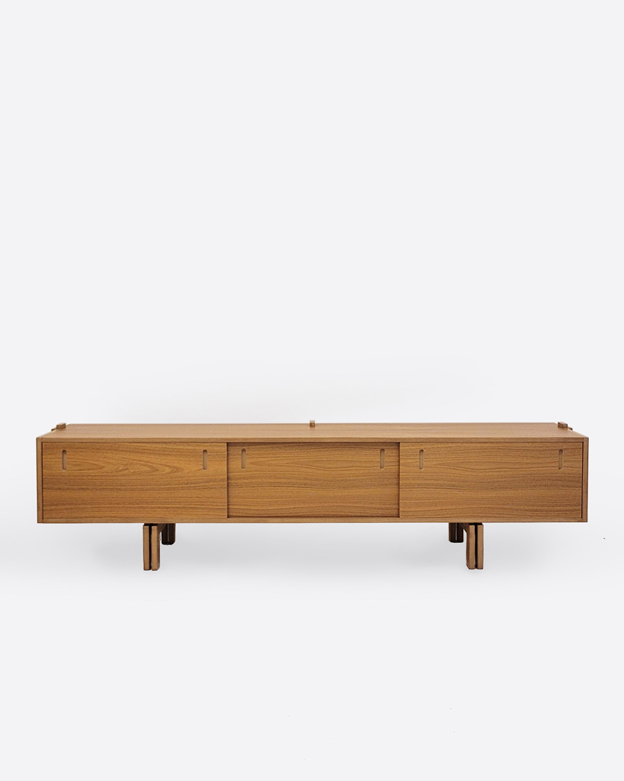 Rack Nipo, 100% de encaixe. Bertha traz em seu mais novo modelo de rack linhas elegantes e clássicas aliadas ao conceito de encaixe. O primeiro móvel da família Nipo apresenta nicho com portas de correr e está disponível em três tamanhos diferentes.